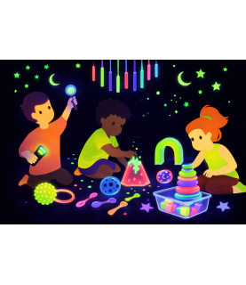 Un atelier sensoriel sous lumière noire, exploration libre des couleurs et textures fluorescentes.